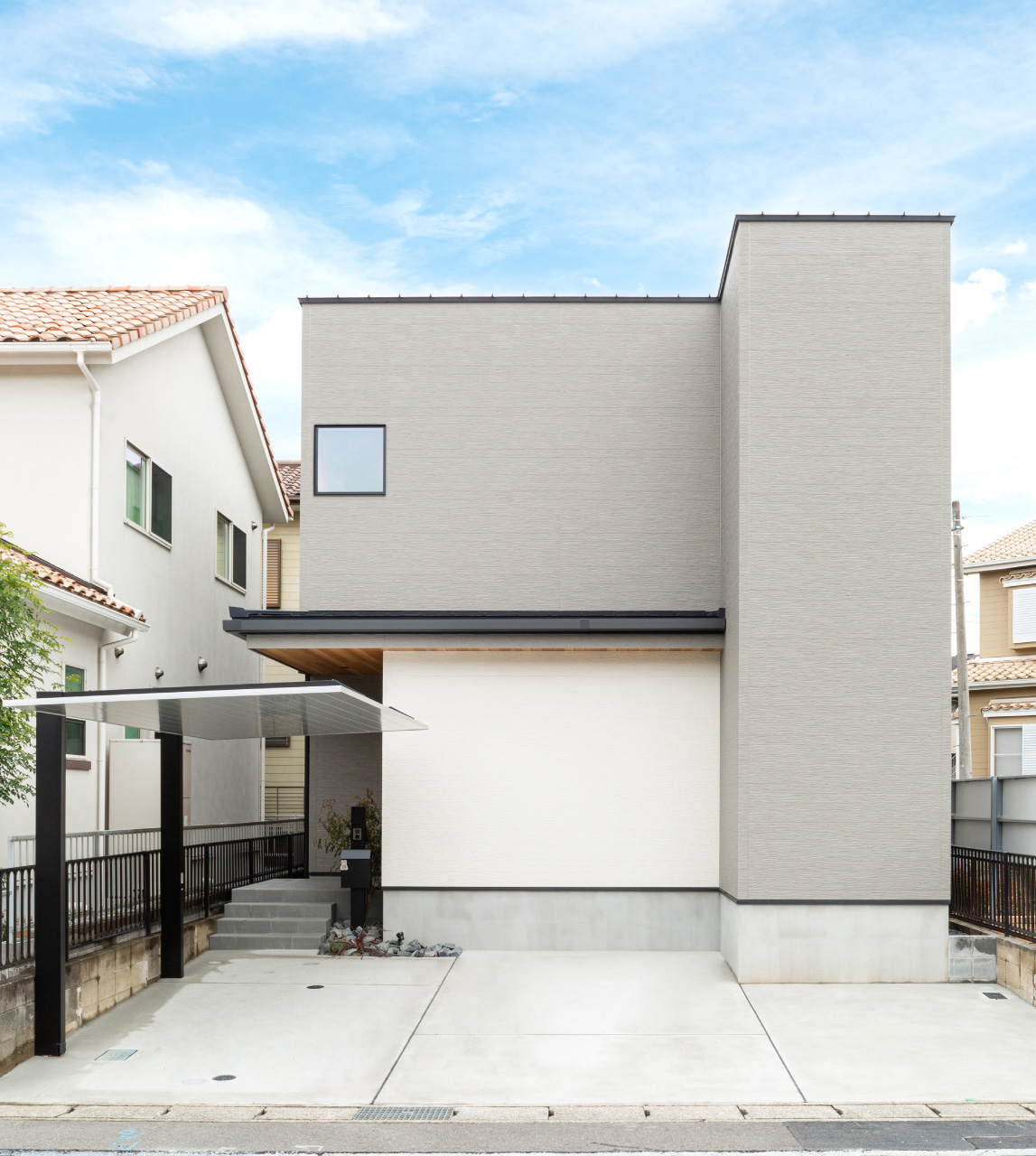 白とグレーのタイル、そして温かみのある木目の玄関ドアが、モダンでありながらも温もりが感じられるデザインを演出。訪れる人をやさしく迎え入れてくれます。