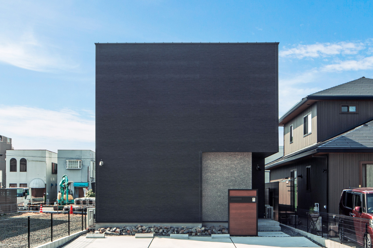 重厚感のあるマットブラックの外壁が目を引く、キューブ型のデザイン。