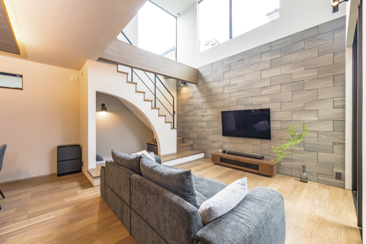 リビングに配した天然石のアクセント壁は、窓を介して中庭まで伸ばして内と外の繋がりを演出。