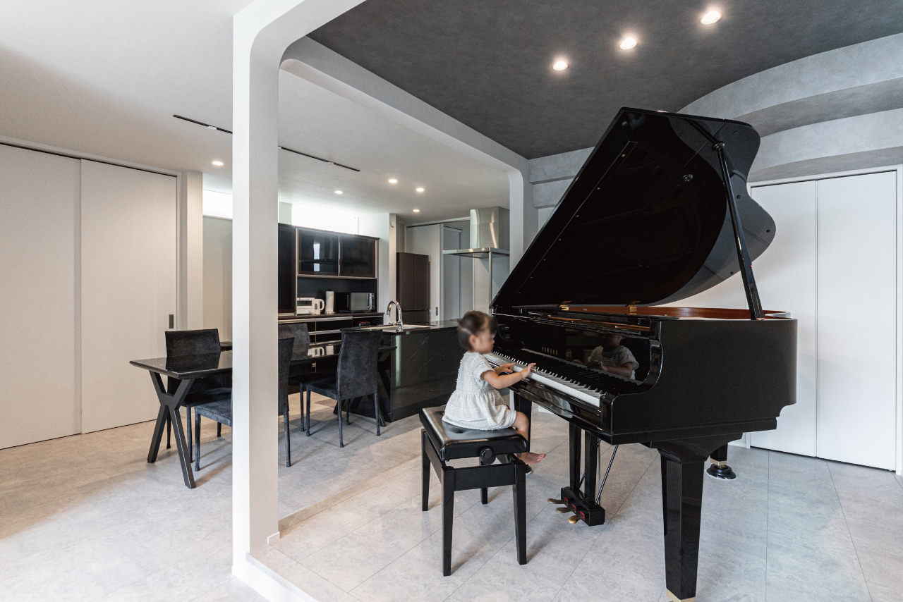 リビングの一角に、グランドピアノを美しく配置できる特別な演奏スペースを設計。