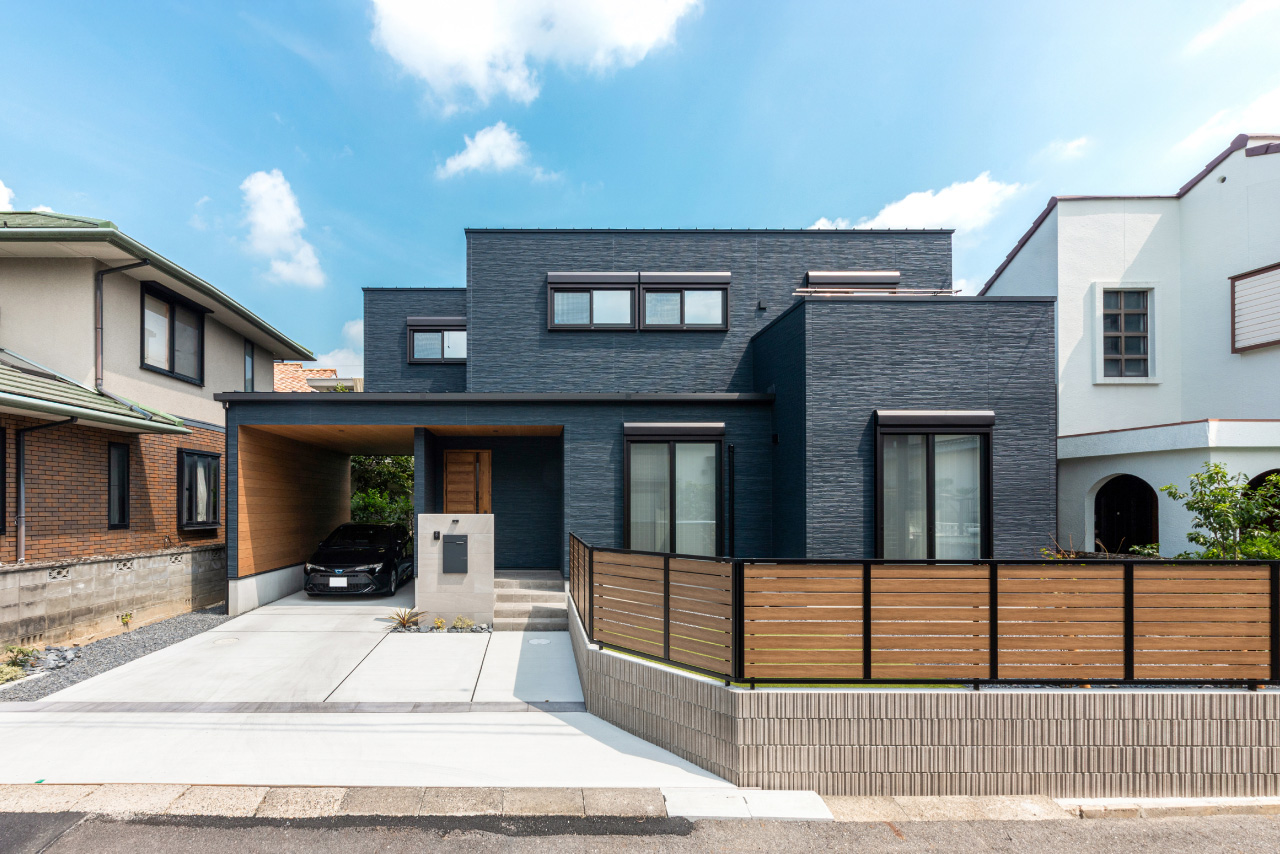 ネイビーと木目の組み合わせが美しい、重厚感のある外観デザイン。