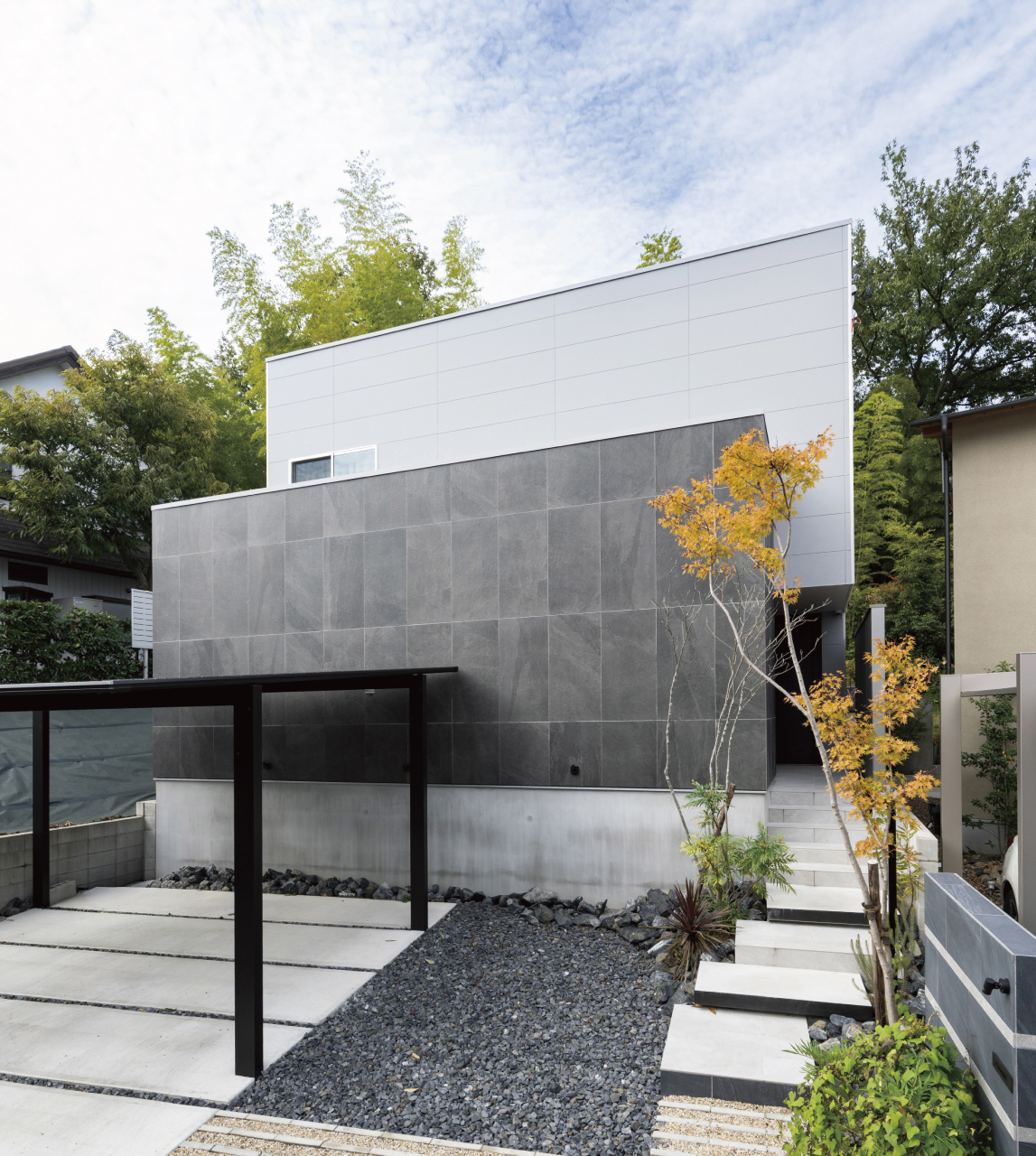 大判のストーン調タイルが目を惹く外壁と、浮遊感のあるアプローチ階段が美しい邸宅