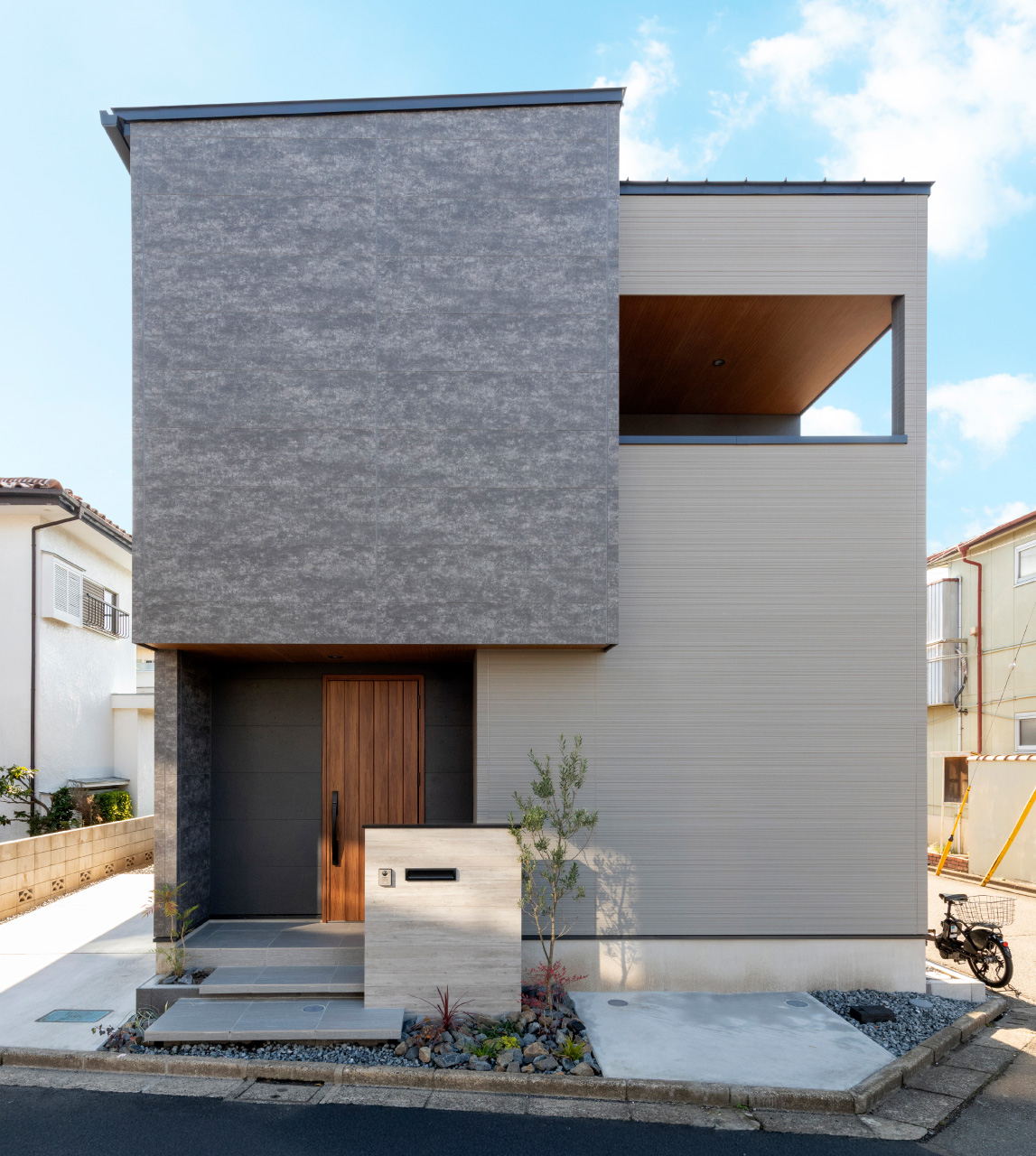 グレーのタイルと木目調の玄関ドアに加え、軒天にも木目を取り入れることで、奥行きと温かみを感じる空間に。