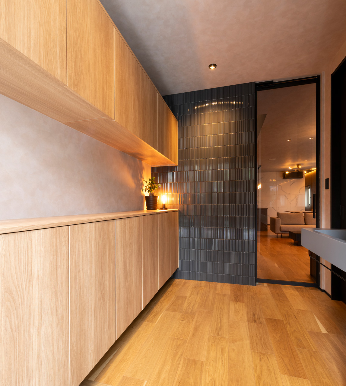 手洗い洗面を彩る繊細なタイルの陰影が、プライベートな空間に凛とした美しさを添えます。