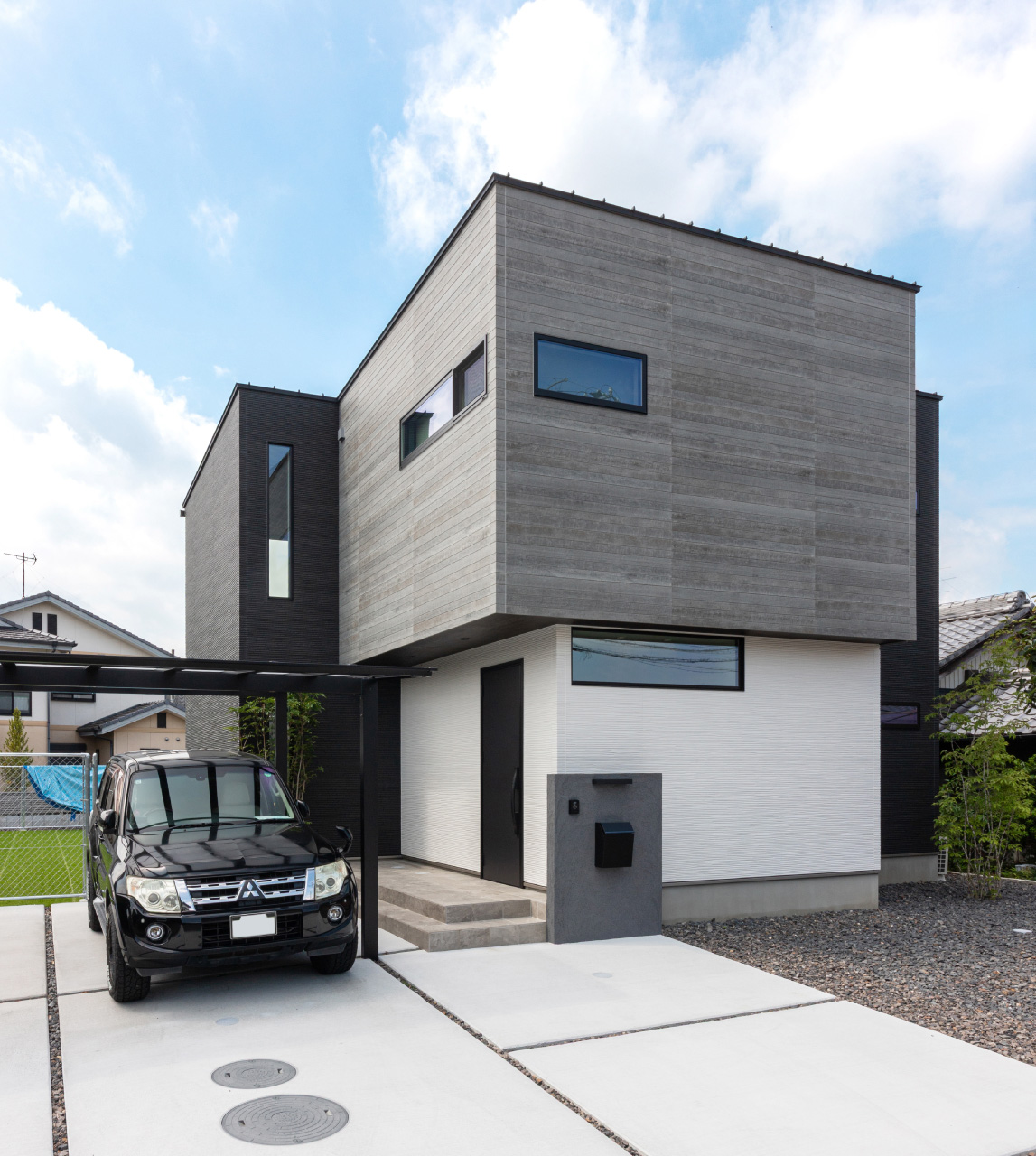 3つの異なるテクスチャの外壁を組み合わせた、存在感を放つスクエアフォルムの外観。